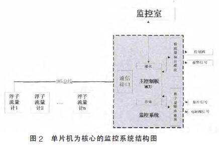 浮子流量計(jì)監(jiān)控系統(tǒng)主要功能是模擬量采集輸出, 數(shù)字量采集輸出,由核心模塊進(jìn)行分析、處理、存儲(chǔ)并和上位機(jī)通信。工業(yè)上常用的監(jiān)控系統(tǒng),從組成結(jié)構(gòu)來看主要分為PLC為核心的監(jiān)控系統(tǒng)、現(xiàn)場總線為核心的監(jiān)控系統(tǒng)、單片機(jī)為核心的監(jiān)控系統(tǒng)。本設(shè)計(jì)主要采用以單片機(jī)為核心的監(jiān)控方法,該系統(tǒng)使用廣泛,體積小、功耗低、操作方便、設(shè)計(jì)簡便、成本低,是許多小型監(jiān)控系統(tǒng)的*選。單片機(jī)為核心的監(jiān)控系統(tǒng)結(jié)構(gòu)如圖2所示。本監(jiān)測系統(tǒng)主要包括現(xiàn)場浮子流量計(jì)組、485總線、主控制板MCU 以及模擬數(shù)字輸出控制模塊。