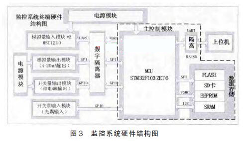 現(xiàn)場浮子流量計(jì)監(jiān)控系統(tǒng)的總體結(jié)構(gòu)如圖2所示。其中硬件系統(tǒng)主要功能是模擬量(溫度、儀表信號(hào))的采集,模擬量(4~20mA 電流)的輸出,開關(guān)量的輸入輸出以及遠(yuǎn)距離RS485串行通訊和數(shù)據(jù)存儲(chǔ)。其中監(jiān)測系統(tǒng)硬件結(jié)構(gòu)如圖3 所示。為增強(qiáng)監(jiān)測系統(tǒng)的抗干擾能力, 本設(shè)計(jì)采用帶隔離的電源模塊以及數(shù)字隔離器確保系統(tǒng)能夠高效穩(wěn)定工作。
