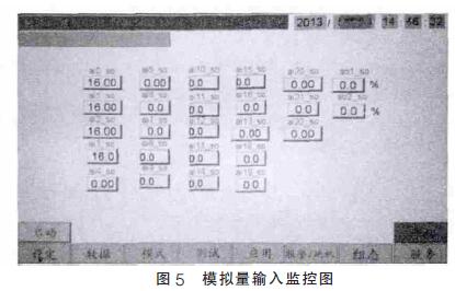 上位機(jī)觸控屏軟件是利用觸控屏供應(yīng)商的組態(tài)軟件設(shè)計(jì)的,作為一個(gè)將運(yùn)用于工業(yè)現(xiàn)場的監(jiān)控設(shè)備,其實(shí)用性和易用性是使用者比較重視的。當(dāng)下位機(jī)的通訊任務(wù)接收到信號(hào)量, 主控制模塊就會(huì)開始和上位機(jī)通信。下位機(jī)將采集到處理完整的數(shù)據(jù)傳輸?shù)缴衔粰C(jī)內(nèi),上位機(jī)將其顯示到觸控屏上,使用者可以通過上位機(jī)了解空壓機(jī)組的實(shí)時(shí)狀態(tài)。圖5 和圖6 就是模擬量和數(shù)字量各個(gè)通道的實(shí)時(shí)值顯示畫面。