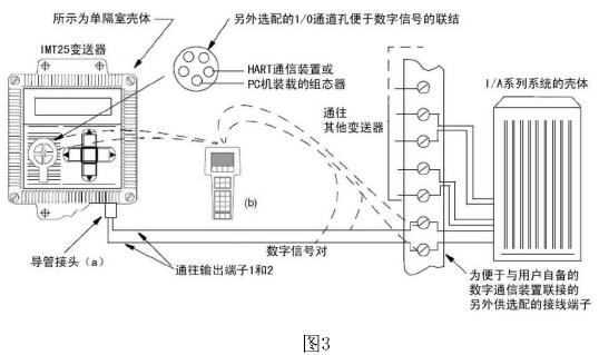 HART通信裝置或裝載在PC機上的組態(tài)器可以連接在變送器現(xiàn)場接線端到外部負載之間的任何位置,或連接到另外配供的1/0孔口上。如圖3所示: