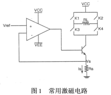 以往的激磁電路的設(shè)計都是采用恒流源和可控開關(guān)電路組成。恒流源是由電壓基準、比較放大、控制調(diào)整和采樣等部分組成的直流負反饋自動調(diào)節(jié)系統(tǒng),常用的激磁電路就是用串聯(lián)調(diào)整型恒流電源盒控制開關(guān)組成的,如圖1。其中Vref是參考電壓,Rs是采樣電阻,Is為流過Rs的電流,就是所需的恒流,RL為電磁流量傳感器線圈,K1、K2、K3、K4為可控開關(guān),以達到使線圈RL中流經(jīng)正負交換的電流,對傳感器激磁。