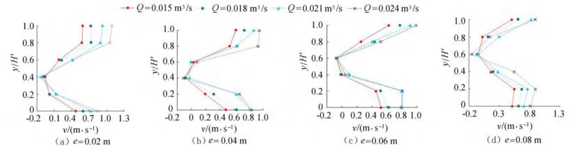 圖4橫坐標為斷面水流方向流速,縱坐標為測點垂向位置與下游水位的比值y/H'。隨著浮體結(jié)構(gòu)位置的上升,*小斷面流速位置同樣上升。以圖3(a)為例,當e=0.02m時,下游斷面位置自下而上呈現(xiàn)先減小、后增大的趨勢,在y/H'=0.40時流速達到*小,隨著浮體結(jié)構(gòu)位置的上升,*小流速呈現(xiàn)向上偏移的趨勢。在斷面位置y/H'=0.20時,隨著e的增大,流速呈現(xiàn)增大的趨勢。當e較小時,流經(jīng)浮體結(jié)構(gòu)下部進行下泄的水流較少,主流出現(xiàn)在浮體結(jié)構(gòu)的上部,且在浮體結(jié)構(gòu)的阻擋作用下出現(xiàn)回流區(qū);隨著e上升,主流偏向浮體結(jié)構(gòu)下部區(qū)域,流速增大。與y/H'=0.20的流速分布正好相反,當y/H'=0.80時,流速分布隨著浮體位置的增大而減小。隨著e的增大,通過浮體結(jié)構(gòu)下部泄流的水體增多,主流開始向下偏移。試驗過程中,浮體結(jié)構(gòu)處于淹沒狀態(tài),流速的分布隨著浮體位置的改變呈現(xiàn)上大、中小、下大的分布趨勢,在浮體結(jié)構(gòu)下游區(qū)域形成回流區(qū),回流區(qū)的位置隨著浮體結(jié)構(gòu)的上升而上升。