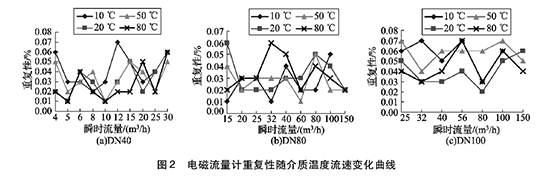 將實(shí)驗(yàn)測(cè)得的給排水流量計(jì)在不同溫度及流速下的重復(fù)性數(shù)據(jù)整理,特性曲線如圖2所示,3組曲線分別對(duì)應(yīng)DN40,  DN80,  DN100的3塊給排水流量計(jì)的重復(fù)性曲線。