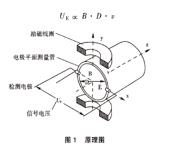 產(chǎn)生與流量成比例的感應(yīng)電勢,流體中產(chǎn)生的感應(yīng)電動勢被位于管子徑向兩端的一對電極拾取,該信號電壓uE與磁場強(qiáng)度B、電極間距離D和平均流速穢成正比。磁場強(qiáng)度B和電極距離D是常數(shù),所以信號電壓與平均流速口成正比。計算公式如下: