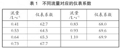 其中自變量為流量,因變量為儀表系數(shù)。當(dāng)流量介于0.4~1L/s時(shí),采用式(1)進(jìn)行計(jì)算;當(dāng)流量超過1.1L/s時(shí),保持儀表系數(shù)恒為69.9。