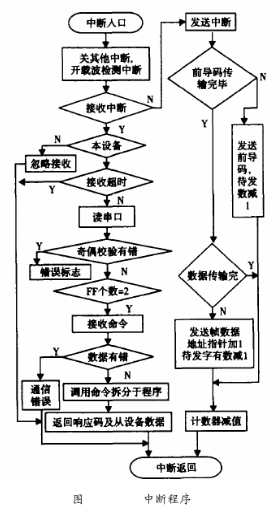 在HART通信中,地下污水流量計作為從設(shè)備進(jìn)行通訊,所以這里的軟件設(shè)計只是針對于從設(shè)備。HART通信采用水平和垂直校驗的方法。當(dāng)檢測到接收數(shù)據(jù)有差錯時,則等到主設(shè)備命令幀發(fā)完后,通知主設(shè)備數(shù)據(jù)接收有誤。主設(shè)備則重新發(fā)命令幀,從而保證通信的準(zhǔn)確可靠。HART中斷子程序流程圖如圖6所示。由于HART通信為主從方式,HART幀中每個字節(jié)在物理層傳輸需要9ms左右,為了保證通訊的實時性,通訊程序采用串行口終端接收/發(fā)送。該中斷所要完成通信中的主要任務(wù),即接收和發(fā)送幀,幀的拆分和打包。
