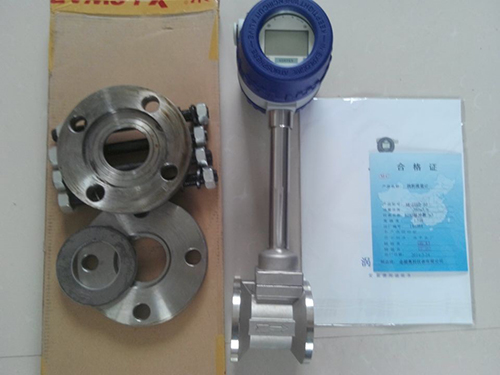 渦街流量計由法蘭卡裝式流量傳感器和顯示儀表組成。法蘭卡裝式流量計將專用法蘭焊接在工藝管道上,然后用螺栓、螺母將儀表固定在兩個法蘭之間。安裝簡單便捷,成本低。本公司提供專用法蘭,不需另行購買安裝法蘭。