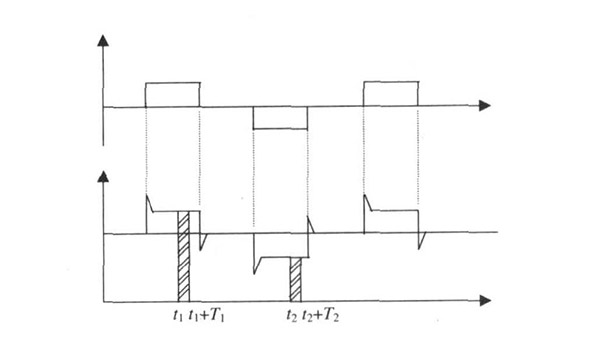 給水廠原水電磁流量計一般都采用工頻交流電源供電, 其電源電壓的幅值和頻率的變化都會給給水廠原水電磁流量計帶來電源性干擾噪聲。對電源電壓的幅值變化, 因采用多級集成穩(wěn)壓, 一般而言電源電壓的幅值變化對電磁流量的測量精度影響不大。當(dāng)電源電壓的頻率波動時, 雖然其波動范圍有限, 但對給水廠原水電磁流量計測量精度影響較大。為了解決工頻干擾問題, 實現(xiàn)對流體流速感應(yīng)電勢eab信號的準(zhǔn)確測量, 需利用以下基本關(guān)系:①勵磁周期為工頻周期的整數(shù)倍, 即勵磁頻率為50/nHz(n為偶數(shù));②正負(fù)勵磁下的同相位采樣。圖2是對應(yīng)低頻矩形波勵磁形式下的典型電勢信號形式, 按上述關(guān)系在一個勵磁周期下, 若假設(shè)t1 和t2 點為工頻干擾的等效干擾點, 且采樣寬度T=T1 =T2 , 則eab的基本算式為: