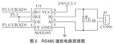 RS485接口組成半雙工網絡,選擇兩線制與上位機電腦相連,采用屏蔽雙絞線傳輸。通信系統(tǒng)整體為總線式結構,這樣1臺上位機*多可以和現場32臺智能儀表相連。采用MAX485芯片完成電壓轉換,圖5為RS485通信電路原理圖。