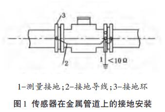 傳感器安裝在塑料管道或內(nèi)壁有絕緣涂層、襯里的管道上,兩端應(yīng)安裝接地環(huán)(或帶有接地電極的金屬短管),然后用導(dǎo)線連接,使管內(nèi)流動的介質(zhì)與大地短路,具有零電位(見圖2)。