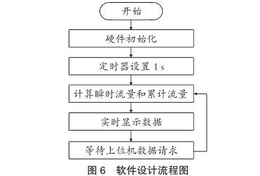 上電后程序?qū)SP的硬件資源進(jìn)行初始化,包括中斷系統(tǒng)、GPIO口、定時(shí)器/計(jì)數(shù)器、通信端口及基本的時(shí)鐘設(shè)置。程序每秒對(duì)接收到的脈沖進(jìn)行計(jì)數(shù),其除以?xún)x表系數(shù)后的結(jié)果作為瞬時(shí)流量,同時(shí)在時(shí)間上對(duì)瞬時(shí)流量進(jìn)行累積,計(jì)算出兩種流量后,將其實(shí)時(shí)顯示在液晶顯示屏上,同時(shí)將數(shù)據(jù)保存,**等待上位機(jī)電腦對(duì)數(shù)據(jù)的讀取。通信采用MODBUS協(xié)議,波特率為9600b/s,無(wú)校驗(yàn),8位數(shù)據(jù)位,1位停止位。圖6為微處理器功能設(shè)計(jì)流程圖。