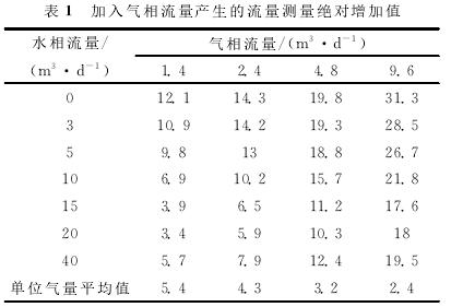 利用清水中渦輪的刻度方程計算加入不同氣體流量后渦輪響應頻率所對應的流量,即為加入氣體后的測量流量,再用所得測量流量減去配比的標準水流量,得到氣相加入后測量的絕對增加值,即加入氣相流量產(chǎn)生的測量誤差(見表1)。計算結果表明,加入氣體流量后,渦輪的測量流量明顯增加,尤其是液相流量較低時,增加的測量流量更高,氣體對流量測量產(chǎn)生了較大的測量誤差。低氣量下,平均1m3/d的氣量產(chǎn)生的測量誤差大約相當于5m3/d(絕對增加值)。