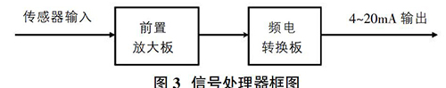 信號(hào)處理器對渦街流量傳感器產(chǎn)生的頻率信號(hào)經(jīng)過濾波、放大、頻電轉(zhuǎn)換等幾個(gè)環(huán)節(jié)處理,*終將頻率信號(hào)轉(zhuǎn)換為標(biāo)準(zhǔn)4~20mA信號(hào)輸出。信號(hào)處理器框圖如圖3所示。