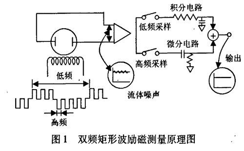 雙頻矩形波勵(lì)磁測(cè)量原理如圖l所示,一個(gè)由高低頻分量迭加而成的電磁場(chǎng)通過(guò)勵(lì)磁線圈被施加到被測(cè)液體中,勵(lì)磁波形是在一個(gè)低頻矩形波上迭加一個(gè)高于市電頻率的矩形波而得到的波形。在產(chǎn)生的電動(dòng)勢(shì)中,低頻分量通過(guò)一個(gè)大時(shí)間常數(shù)的積分電路獲得一個(gè)零點(diǎn)穩(wěn)定性好的平穩(wěn)流量信號(hào)。而由漿液或低電導(dǎo)率流體產(chǎn)生的低頻噪聲可被不受噪聲影響的高頻采樣電路所抑制,有著同樣時(shí)間常數(shù)的流量信號(hào)經(jīng)過(guò)一個(gè)差分電路以確定流速信號(hào)的變化,把這兩種不同頻率采樣所得的信號(hào)結(jié)合起來(lái)可獲得一個(gè)穩(wěn)定流速信號(hào),該信號(hào)不受噪聲干擾,且有較高的零點(diǎn)穩(wěn)定性。