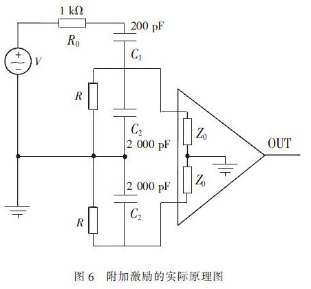 如圖6 所示為附加激勵的實際原理圖。其中R是流體電阻,C1是激勵源與傳感器電極及其放大器輸入的隔直電容,C2是信號電纜的對地電容。