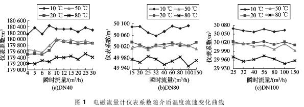將實驗測得的農(nóng)藥流量計在不同溫度及流速下的儀表系數(shù)數(shù)據(jù)整理,特性曲線如圖1所示,3組曲線分別對應(yīng)DN40、DN80、DN100的3塊農(nóng)藥流量計的儀表系數(shù)曲線。