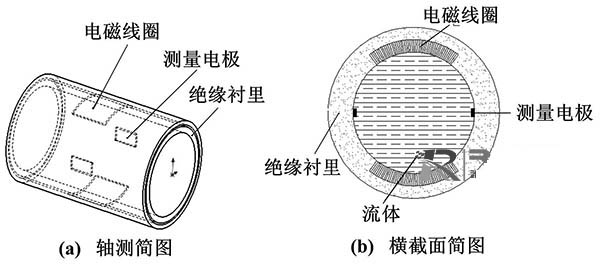 電極與被測流體通過絕緣管形成檢測電容,通過此電容來藕合流量信號。其主要的結(jié)構(gòu)形式按照電極的安裝位置可以分為兩種:電極嵌人測量管的絕緣襯里內(nèi)部(嵌人式)、電極貼在測量管外部(外貼式)。嵌入式結(jié)構(gòu)與普通管道式電磁流量計結(jié)構(gòu)相似,而外貼式大多是通過陶瓷表面金屬化技術(shù)將電極貼在測量管外。
