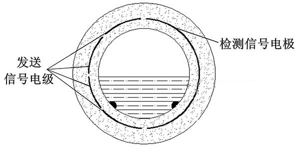 ③利用阻抗或信號衰減研制的非滿管管道式電磁流量計。這種結(jié)構(gòu)的非滿管管道式電磁流量計是當(dāng)前國內(nèi)研究的方向之一。其結(jié)構(gòu)是流量管底部貼一對信號發(fā)射電極,在流量管中間貼信號接收電極。由于信號在流體中傳播會產(chǎn)生衰減,且傳播時間越長,衰減越多,因此通過信號接收電極接收到的信號衰減量即可得知液面高度;同時該電極還能測量流體切割磁感線產(chǎn)生的電動勢,以此達到測量非滿管流量的目的。阻抗式或信號衰減非滿管管道式電磁流量計結(jié)構(gòu)簡圖如圖5所示。
