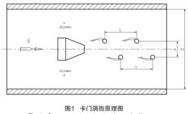 插入式煙氣流量計(jì)實(shí)現(xiàn)流量測(cè)量的理論基礎(chǔ)是流體力學(xué)中**的“卡門(mén)渦街”原理,在流動(dòng)的流體中裝置一個(gè)非線性三角柱形體,即渦旋發(fā)生體,如圖 1 所示。當(dāng)流體沿渦旋發(fā)生體繞流時(shí),會(huì)在渦旋發(fā)生體下游產(chǎn)生兩列不對(duì)稱,但有規(guī)律交替地分離釋放出一系列漩渦束,只有當(dāng)兩渦漩列之間的距離 h 和同列的兩渦漩之間的距離 L 之比滿足 h/L=0.281 時(shí),所產(chǎn)生的渦街才是穩(wěn)定的。