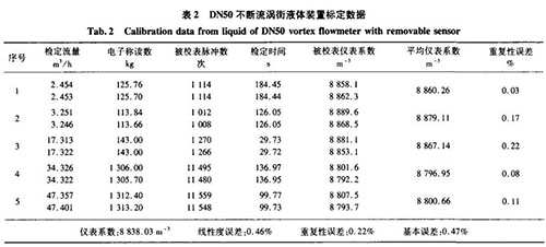 分別用精度0.5級(jí)音速噴嘴氣體標(biāo)定裝置、精度0.2級(jí)稱重法水標(biāo)定裝置對(duì)DN50口徑的不斷流渦街進(jìn)行實(shí)際標(biāo)定,其標(biāo)定數(shù)據(jù)如表1、表2所示。