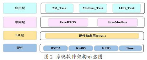 Modbus 通訊模塊的軟件架構如圖 2 所示,分為硬件層、硬件抽象層,中間層和應用層。中間層包括一個實時操作系統(tǒng)FreeRTOS 和一個針對嵌入式環(huán)境開發(fā)的輕量級 Modbus 協(xié)議庫Freemodbus。在應用層,主要創(chuàng)建了三個任務,232_Task 負責讀 取和解析流量計表頭輸出的文本信息,Modbus_Task 負責存儲 解析后的流量計數(shù)據(jù)到 Modbus 寄存器表,以及以 Modbus 協(xié)議與取水監(jiān)測設備通信,LED_Task 是一個輔助任務,主要用來提示程序運行狀態(tài)。