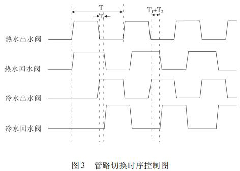 開始試驗(yàn),冷熱水箱預(yù)先達(dá)到試驗(yàn)要求溫度,水泵運(yùn)轉(zhuǎn)調(diào)節(jié)管路流量至設(shè)定值。系統(tǒng)給定信號(hào)控制四個(gè)開關(guān)閥(熱水出水閥、熱水回水閥、冷水出水閥、冷水回水閥) 的打開與關(guān)閉,實(shí)現(xiàn)冷熱水的切換。熱水沖擊時(shí),熱水出水閥與熱水回水閥打開的同時(shí),冷水出水閥與冷水回水閥關(guān)閉,確保試驗(yàn)管路熱水沖擊;同理,冷水沖擊時(shí),冷水出水閥與冷水回水閥打開,熱水出水閥與熱水回水閥關(guān)閉,確保試驗(yàn)管路冷水沖擊。系統(tǒng)通過(guò)四個(gè)開關(guān)閥對(duì)管路進(jìn)行時(shí)序控制,達(dá)到管路切換的目的,很好地實(shí)現(xiàn)了 4000次冷熱循環(huán)沖擊試驗(yàn)。其具體的管路切換控制時(shí)序圖如圖 3 所示。