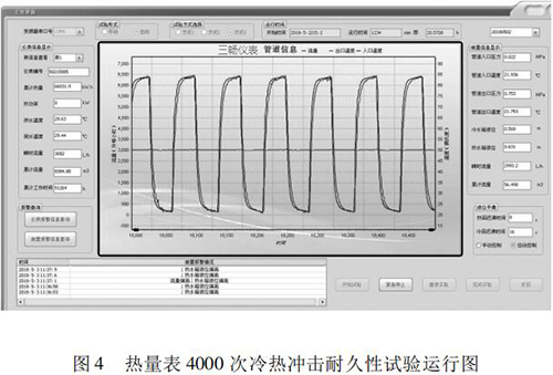本文研究的 4000 次冷熱沖擊試驗(yàn)的實(shí)現(xiàn)具有以下特點(diǎn): (1)基于“工控機(jī) +水泵 + 化工污水流量計(jì)”的閉環(huán)控制系統(tǒng),實(shí)現(xiàn)了流量自動(dòng)反饋調(diào)節(jié),滿足試驗(yàn)要求; (2)通過(guò)四個(gè)開關(guān)閥的時(shí)序切換,自動(dòng)控制試驗(yàn)溫度,很好的完成了 4000 次溫度沖擊試驗(yàn); (3)通過(guò)“工控機(jī) + 數(shù)據(jù)數(shù)據(jù)采集卡”的數(shù)據(jù)采集系統(tǒng),實(shí)時(shí)監(jiān)控試驗(yàn)過(guò)程中的流量、溫度、壓力等相關(guān)參數(shù),實(shí)現(xiàn)試驗(yàn)方式的自動(dòng)控制,并能對(duì)試驗(yàn)數(shù)據(jù)進(jìn)行分析與評(píng)定。 (4)試驗(yàn)的全過(guò)程為智能自動(dòng)化,可無(wú)人員留守看護(hù)。試驗(yàn)結(jié)果可直接反映出熱量表在長(zhǎng)時(shí)間運(yùn)行后的可靠性。為我國(guó)熱量表耐久性試驗(yàn)研究提供檢測(cè)手段,為促進(jìn)產(chǎn)品質(zhì)量提升做好技術(shù)保障。