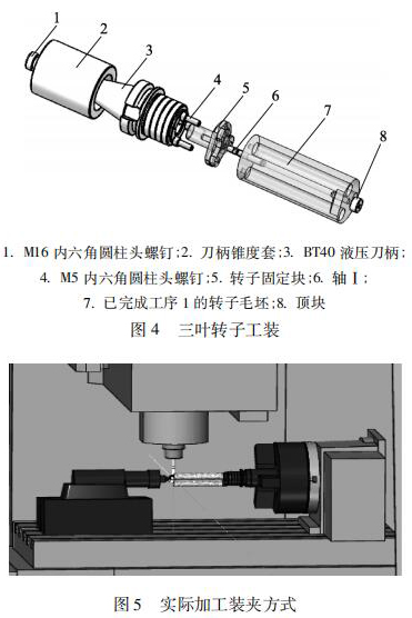 目前量產(chǎn)中的轉(zhuǎn)子都是型材毛坯,采用成型砂輪磨削或者定制成型銑刀進(jìn)行加工轉(zhuǎn)子曲面。這種加工方式工藝成熟,適合大批量生產(chǎn),而且有利于轉(zhuǎn)子線型的技術(shù)保密,但加工方式在研發(fā)試制中應(yīng)用試制加工周期會很長,而且成本很高,不適合單件或小批量試制。為此,筆者基于四軸立式加工中心,結(jié)合三葉轉(zhuǎn)子加工工藝提出一種工裝,如圖 4所示。將這套工裝定位在立式加工中心四軸回轉(zhuǎn)中心上,加工裝夾方式如圖 5 所示。用機(jī)床尾軸頂住轉(zhuǎn)子來增強(qiáng)加工剛性避免切削時產(chǎn)生震顫。