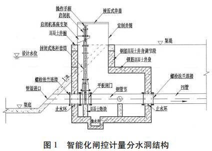 分水洞采用了一種封閉式啟閉閘集成閘井預(yù)制件,包括頂節(jié)、標(biāo)準(zhǔn)節(jié)和底座。與傳統(tǒng)現(xiàn)場(chǎng)澆筑的方式相比,集成閘井采用防水設(shè)計(jì),并且安裝更加方便快捷,很大程度上提高了安裝效率,節(jié)約成本。采用事先預(yù)制好的啟閉閘支座、啟閉機(jī)機(jī)座,保證了設(shè)備的安裝精度,提高了設(shè)備運(yùn)行的穩(wěn)定性,減少了設(shè)備的后期維護(hù)。分水洞結(jié)構(gòu)除了預(yù)制混凝土外,還可考慮采用玻璃鋼或工程塑料整體制作,用標(biāo)準(zhǔn)節(jié)調(diào)節(jié)高度。分水洞結(jié)構(gòu)設(shè)計(jì)見圖 1。