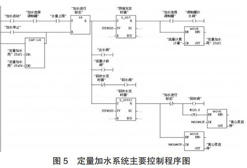 定量加水系統(tǒng)的工作過程為:當(dāng)設(shè)定好加水量后,啟動(dòng)系統(tǒng),多級(jí)離心泵 10、回流閥 4、出水閥 9 和流量計(jì)前閥 12開啟對(duì)管路進(jìn)行預(yù)填充;延時(shí) 30s 預(yù)填充完成后,回流閥 4關(guān)閉,調(diào)制罐補(bǔ)水閥 14 開啟,同時(shí)質(zhì)量流量計(jì) 13 開始計(jì)量;當(dāng)質(zhì)量流量計(jì)的累積量與設(shè)定加水量一致時(shí),出水閥 9 和調(diào)制罐補(bǔ)水閥 14 關(guān)閉;調(diào)制罐定量加水完成后,開啟回收閥17 和回流閥 4 以及同未關(guān)閉流量計(jì)前閥 12 一起,利用壓縮空氣對(duì)管道中水實(shí)現(xiàn)回收;延時(shí) 30s 水回收完成后,關(guān)閉多級(jí)離心泵、球閥 4、12 和 17,定量加水過程完成。定量加水系統(tǒng)主要控制程序如圖 5 所示。