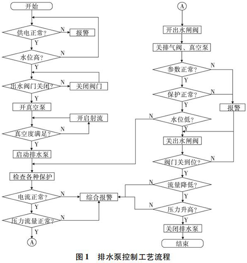 排水泵進行自動化控制模式后,當水倉水位達到開泵要求,PLC 自動檢測電動閥門、球閥、供電電壓等是否正常后,啟動真空泵進行抽真空,當水泵真空度符合開泵要求時便啟動排水泵。排水泵正常運轉后 PLC 時時收集運行數據進行比對,當發(fā)現運行數據比對出現差異時影響到排水泵正常運轉時,會發(fā)出停泵命令。排水泵控制工藝流程如圖 1 所示。