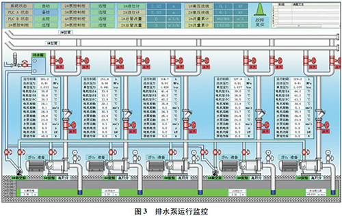 泵房自動化監(jiān)控系統實時監(jiān)測水泵各工況參數,含水倉水位、水泵運行電壓、電流、排水壓力、單管流量、引水真空度等,控制水泵、電動閘閥、真空泵的開停,及水泵排水電耗統計( 如圖 3 所示) 。其主要數據收集如下。