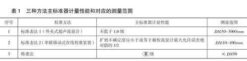 本規(guī)范包含三種校準(zhǔn)方法,分別為標(biāo)準(zhǔn)表法 1(外夾式超聲流量計(jì))、標(biāo)準(zhǔn)表法 2(串聯(lián)移動(dòng)式在線校準(zhǔn)裝置)和稱(chēng)重法,編制組對(duì)每種方法進(jìn)行了大量的實(shí)驗(yàn),并積極與管道式流量計(jì)生產(chǎn)廠家及用戶(hù)溝通探討,積累了豐富的經(jīng)驗(yàn),獲得了大量的實(shí)驗(yàn)數(shù)據(jù),*終確定三種方法的主標(biāo)準(zhǔn)器計(jì)量性能和對(duì)應(yīng)的測(cè)量范圍,如表 1 所示。