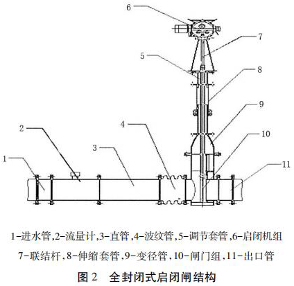 包括進(jìn)水管、直管、出水管、一氧化碳流量計(jì)組和啟閉機(jī)組,進(jìn)水管、直管、出水管從左到右依次連接,一氧化碳流量計(jì)組安裝在直管和出水管之間且位于出水管的入口處,一氧化碳流量計(jì)組通過(guò)聯(lián)結(jié)桿與啟閉機(jī)組的輸出端連接。為防止泥沙淤積影響啟閉,一氧化碳流量計(jì)采用閘板式啟閉結(jié)構(gòu)。密封式啟閉閘為整體封閉管道式,全部采用不銹鋼材料,水流通過(guò)管道流出讓整個(gè)閘井內(nèi)干燥無(wú)水。伸縮套管與波紋管的設(shè)計(jì)讓檢修與清理淤泥更加方便。一氧化碳流量計(jì)裝有荷載限制器,其布置受力明確、結(jié)構(gòu)緊湊、動(dòng)作可靠。當(dāng)?shù)蹙呱系暮奢d達(dá)到額定值的 110%時(shí),或電機(jī)電流超過(guò)額定電流 150%時(shí),系統(tǒng)自動(dòng)切斷操作電源以保護(hù)設(shè)備安全。
