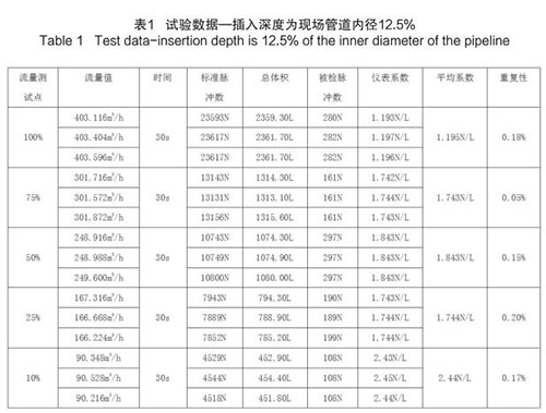 插入式壓縮空氣流量計插入深度為現(xiàn)場管道內(nèi)徑的 12.5%時,試驗數(shù)據(jù)如下(以 DN200 為例):