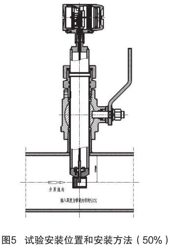 對插入式壓縮空氣流量計和插入式電磁流量計的結(jié)構(gòu)原理進(jìn)行分析,插入式電磁流量計的信號采集點在標(biāo)校管道內(nèi)12.5% 為宜,因它屬電磁類流量計,而壓縮空氣流量計是根據(jù)“卡門渦街”原理進(jìn)行測量管道內(nèi)流量,根據(jù)標(biāo)校管道內(nèi)層流和湍流的分析,以及插入式壓縮空氣流量計獨特的探頭結(jié)構(gòu)形式,確定插入式壓縮空氣流量計的插入深度為標(biāo)校管道內(nèi) 50%,試驗安裝位置和安裝方法如圖 5 所示。