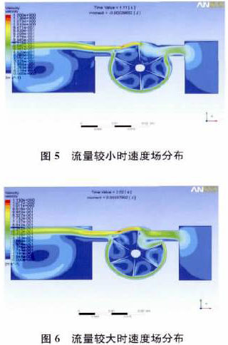 (1)數(shù)值仿真結(jié)果與物理實驗結(jié)果基本一致,當流速低于啟動排量,渦輪未啟動時,流體沿葉片做繞角運動,葉片兩側(cè)壓力相等,葉片不轉(zhuǎn)動;當流速高于啟動排量,渦輪轉(zhuǎn)動時,流體在腔內(nèi)產(chǎn)生旋渦,造成葉片兩邊壓差,從而造成葉片轉(zhuǎn)動。