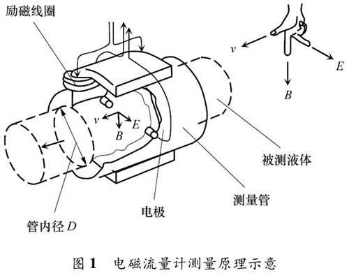 乙醇管道流量計(jì)的測(cè)量原理如圖 1 所示。根據(jù)法拉*電磁感應(yīng)定律,導(dǎo)電液體在磁場(chǎng)中流動(dòng)會(huì)產(chǎn)生電動(dòng)勢(shì) E,它與磁感應(yīng)強(qiáng)度 B、導(dǎo)電液體平均流速 v 成一定比例關(guān)系: