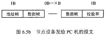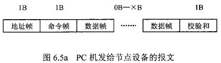 插入式電磁流量計(jì)等節(jié)點(diǎn)設(shè)備和C機(jī)通信的過(guò)程中,由地址幀、命令幀、數(shù)據(jù)幀、校驗(yàn)和可組成各種功能不同的報(bào)文。由于采用主從工作方式來(lái)實(shí)現(xiàn)通信,插入式電磁流量計(jì)等節(jié)點(diǎn)設(shè)備僅能接收并執(zhí)行PC機(jī)發(fā)送來(lái)的控制命令,而不能發(fā)送命令給PC機(jī)。因此,由PC機(jī)發(fā)往流量計(jì)等節(jié)點(diǎn)設(shè)備的報(bào)文一般包括一個(gè)地址幀,一個(gè)命令幀,若干個(gè)數(shù)據(jù)幀和一個(gè)校驗(yàn)和,其報(bào)文格式圖.6a5所示;而由流量計(jì)等節(jié)點(diǎn)設(shè)備發(fā)往PC機(jī)的報(bào)文一般包括一個(gè)地址幀,若干個(gè)數(shù)據(jù)幀和一個(gè)校驗(yàn)和,其報(bào)文格式如圖6.5b所示。