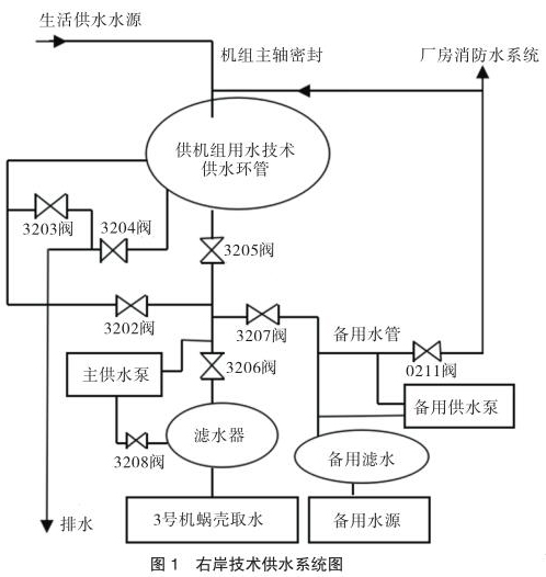 技術(shù)供水系統(tǒng)設(shè)有主、備用水源。主水源是蝸殼取水,作為機(jī)組技術(shù)供水的主用水源。備用水源有兩個,一個是設(shè)在 1 號機(jī)段的壩前取水,取水口高程為 145m,另一個是同 4 號機(jī)組蝸殼取水共用取水口的蝸殼備用取水。兩路備用水源均接到備用總水管,并通過 X207 閥分別與各臺機(jī)組的技術(shù)供水系統(tǒng)相連通(見圖 2)。