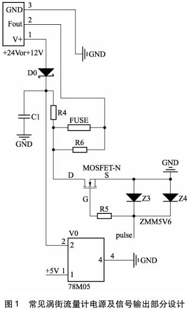 絕大多數(shù)的電磁干擾,都是通過電源線、信號(hào)線進(jìn)入到電子電路內(nèi),同樣,渦街蒸汽流量計(jì)也是如此。圖 1 為常見渦街蒸汽流量計(jì)電源及信號(hào)輸出部分設(shè)計(jì)。