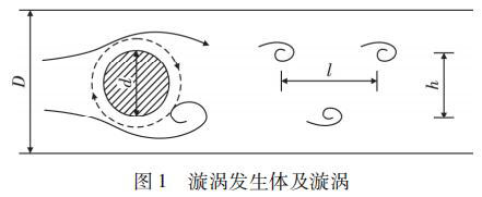 蒸汽流量計是由漩渦發(fā)生體、頻率檢測器和信號轉(zhuǎn)換器等環(huán)節(jié)組成,輸出 4 ~ 20 mADC 信號或脈沖電壓信號。其測量原理是在流動的流體中的垂直流動方向安放 1 根或多根非流體型阻流體,在一定的流量范圍內(nèi),流體在阻流體兩側(cè)交替地分離、釋放出 2 串頻率正比于管道內(nèi)的平均流速、規(guī)則的、不對稱有規(guī)律的交替漩渦列,如圖 1 所示,且兩側(cè)漩渦旋轉(zhuǎn)方向相反。采用檢測元件測出漩渦頻率就可以推算出流體的流量。