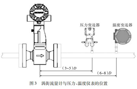 蒸汽流量計的口徑如果與工藝管道相同,不能滿足流量儀表要求時,或者在此流速下測量準確度不能保證時,需要縮小儀表口徑,從而提高管內(nèi)流速,保證測量精度。上下游必須有足夠的直管段,若傳感器安裝點的上游在同一平面上有 2 個 90°彎頭時,上游直管段≥25D,下游直管段≥5D。根據(jù)測量的需要,需在蒸汽流量計附近測量壓力和溫度時,測壓點應在傳感器下游的( 3 ~ 5) D 處,測溫點應在傳感器下游的( 6 ~ 8) D 處,如圖 3 所示。