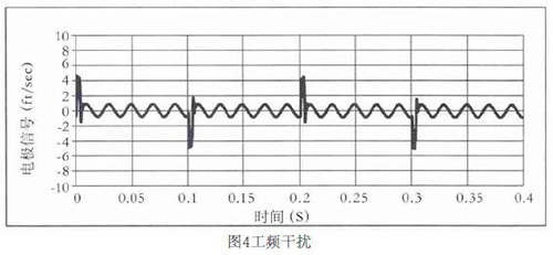 工頻干擾是高溫電磁流量計常見的干擾源。當流量計處于電源形成電磁場中時,由于分布電容的存在,以電磁波的輻射形式干擾電極信號,或者是由供電電源引入的工頻串擾,工作現(xiàn)場的工頻共模干擾,其產(chǎn)生的物理機理均是電磁感應原理。幅度與流量信號相比,往往要大幾個數(shù)量級,頻率與供電電源頻率相同。如圖4所示,線圈驅(qū)動頻率為5Hz的電極信號,被耦合了50Hz的工頻干擾,幅度大概相當于1feet/s。