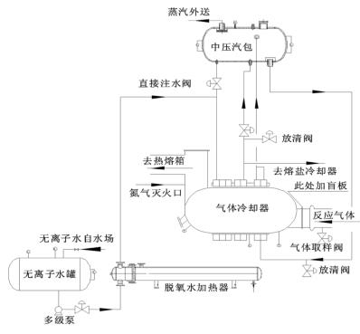 來自無離子水罐的脫氧水經(jīng)多經(jīng)泵加壓、經(jīng)脫氧水加熱器加熱后進入到智能型渦街流量計的水段,脫氧水與反應氣體換熱后分兩路:一路進入中壓汽包,保證汽包有穩(wěn)定的液位;一路進入熔鹽冷卻器帶出熔鹽攜帶的反應熱。來自中壓汽包的高溫水經(jīng)管路接至智能型渦街流量計汽段底部,高溫水與反應氣體換熱后產(chǎn)生高壓蒸汽,高壓蒸汽又返回中壓汽包。汽包還有一路直接注水管路,此路水不經(jīng)過智能型渦街流量計水段,而是直接進入汽包。在智能型渦街流量計出口溫度偏低而汽包液位也比較低時,可開此直接注水管路來穩(wěn)定汽包液位。其詳細流程圖如圖 2。