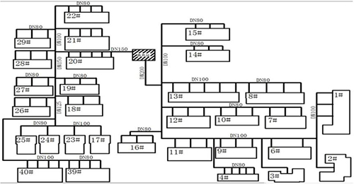 某小區(qū)住宅樓建設(shè)于1996年,建筑結(jié)構(gòu)為磚混建筑,建筑面積為54931m2,共30棟住宅樓。2017年繳費(fèi)739戶,總采暖面積為47141m2。換熱站位于小區(qū)中部,板式換熱機(jī)組設(shè)計(jì)換熱面積為50000m2,循環(huán)泵額定功率為30kW,流量為200m³/h,揚(yáng)程為32m。庭院管網(wǎng)共分為2個(gè)支狀供回水環(huán)路,該小區(qū)供熱管網(wǎng)見圖1所示。