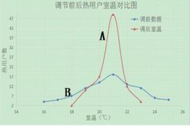 圖3中的曲線 A和B供熱管網(wǎng)渦街氣體流量計(jì)調(diào)節(jié)前后的熱用戶室溫變化情況,橫坐標(biāo)表示室溫分布,縱坐標(biāo)表示熱用戶數(shù)量。從圖中可以看出,渦街氣體流量計(jì)調(diào)節(jié)前熱用戶室溫比較分散,既有室溫小于18℃的熱用戶,也有室溫大于24℃的熱用戶。熱用戶室溫“近熱遠(yuǎn)冷”,供熱管網(wǎng)存在水力不平衡現(xiàn)象。渦街氣體流量計(jì)調(diào)節(jié)后,有49戶用戶室溫在20℃~21℃之間,從圖中可以看出室溫分布范圍縮小,平均室溫降低,從而,不僅減少了供熱量,也大大提高了供熱品質(zhì)。一般來講,對(duì)采暖系統(tǒng),每增加 1℃平均室溫,能耗增多 5%~10%。采暖系統(tǒng)實(shí)現(xiàn)平衡后,常??梢越档推骄覝?℃~3℃。