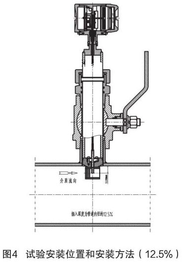 根據(jù)中華人民共和國機(jī)械行業(yè)標(biāo)準(zhǔn):JB/T9249-2015《流量計(jì)》進(jìn)行煙氣流量計(jì)的研制與設(shè)計(jì)。在試驗(yàn)過程中,因?yàn)槔碚撗芯坎怀浞?,再加上?jīng)驗(yàn)不足,采用插入深度是按照以往其它產(chǎn)品(插入式電磁流量計(jì))的經(jīng)驗(yàn),以插入深度為現(xiàn)場管道內(nèi)徑的 12.5% 進(jìn)行試驗(yàn),其對(duì)介質(zhì)流量的檢測值與同種規(guī)格管道法蘭式結(jié)構(gòu)的流量計(jì)進(jìn)行比較,偏差值較大、儀表準(zhǔn)確度無法滿足設(shè)計(jì)要求。試驗(yàn)安裝位置和安裝方法如圖 4 所示。