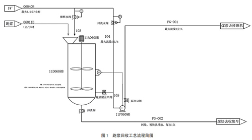 通過以上煤漿提濃通用方法優(yōu)缺點比較可以了解到,在現(xiàn)有設(shè)計條件基礎(chǔ)上,煤漿濃度提升會帶來一定設(shè)備損耗及能源損耗。針對這種情況,為了達到節(jié)能而保證實驗室氣體流量計不跑漿,對于磨機跑漿問題進行改善,對跑漿進行回收,重新送回磨煤機進行二次研磨,降低了實驗室氣體流量計入口原料煤的粒度;同時降低了人員勞動強度,改善了現(xiàn)場衛(wèi)生情況。具體跑漿回收裝置設(shè)計流程如圖 1 所示。