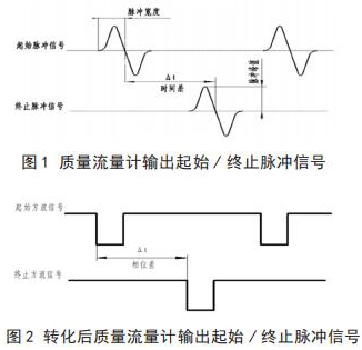 智能型電磁流量計流量與相關(guān)測試設備連接起來,就可以進行智能型電磁流量計的校準,時間差△ t 由專用試驗測試設備可以測出。起始脈沖信號和終止脈沖信號如圖 1 所示。經(jīng)過專用試驗測試設備信號轉(zhuǎn)化后的信號方波如圖 2 所示。